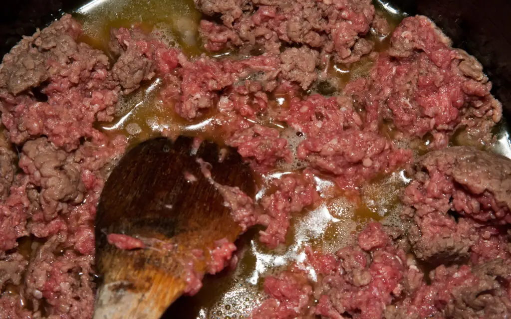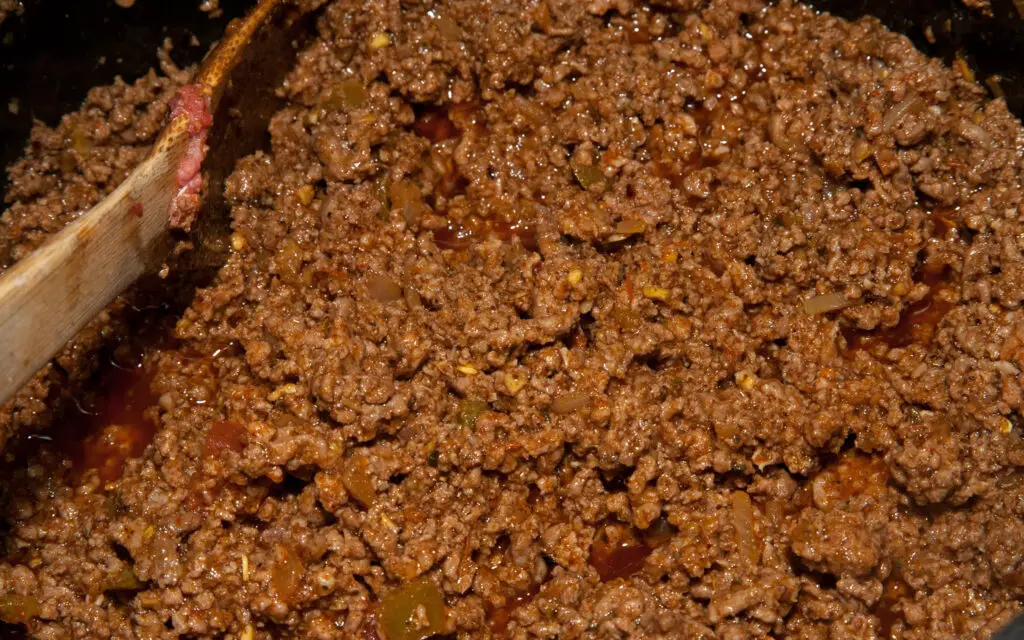 Put the ingredients into a bowl. Cover and Shake well. Set aside. Slowly brown the ground beef. When cooking ground beef, don’t be tempted to cook with your stove on high. Keep it below the medium setting. It’s easy to over cook ground beef. It should remain juicy and chewy. Try to rest the ground beef outside of the refrigerator for an hour or two. It cooks better when it’s at room temperature. (Don’t let it rest any more than this. The FDA says it’s not good to go longer.)